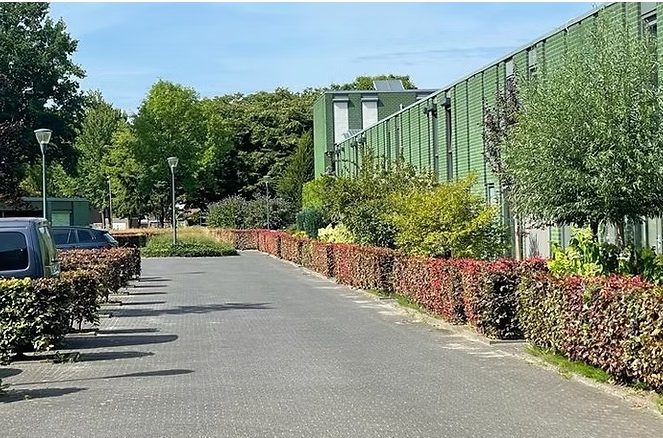De uitstraling van de Beukenlaar is uniek: groene stenen met gemalen en ingestrooid glas, schitterend in de zon, omgeven door een mooi stukje groenvoorziening met rode beukenhagen.